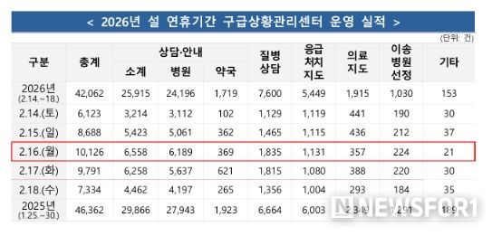 뉴스포원(NEWSFOR1) 윤경덕 기자 | 소방청은 2026년 설 연휴 기간(2.14.~2.18., 5일간)전국 총 45,082건의 구급 출동으로 24,166명을 이송하였으며, 구급상황관리센터에서 총 42,062건의 상담을 실시했다고 밝혔다.