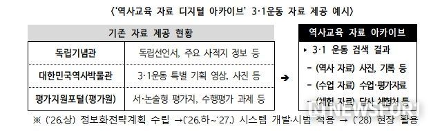 또한, 학생의 탐구 역량을 키우는 역사 수업 활성화를 위해 ‘탐구 중심 역사 교육과정 운영 사례집’(’26. 3종→’27. 9종)을 개발·보급한다. 더불어, 각종 기관·누리집(플랫폼) 등에 분산된 근현대 사료와 교육자료, 체험 자료 등을 수업에 즉시 활용할 수 있도록 교사에게 묶음(패키지) 형태로 제공하는 ‘역사교육 자료 아카이브’를 구축(ʹ27)할 예정이다.