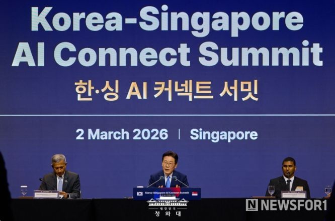 뉴스포원(NEWSFOR1) 윤경덕 기자 | 싱가포르를 국빈 방문한 이재명 대통령은 2일(현지시간) 오후 '한·싱 AI 커넥트 서밋'에 참석해 "대한민국과 싱가포르의 동반성장으로 AI 산업의 흐름을 선도하는 'AI 대항해 시대'를 열어갈 것"이라고 밝혔다.