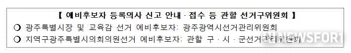 뉴스포원(NEWSFOR1) 윤경덕 기자 | 중앙선관위는 3월 5일 '전남광주통합특별시 설치를 위한 특별법'이 공포됨에 따라, 전남, 광주의 시·도지사(교육감 포함) 및 지역구시·도의회의원 선거의 예비후보자가 그 신분을 유지하려면 3월 16일까지 예비후보자 등록의사를 관할 선거구위원회에 서면으로 신고해야 한다고 밝혔다.