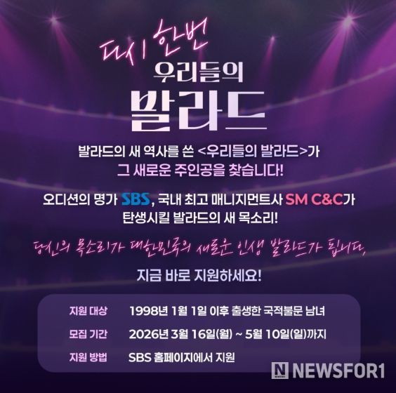 제작진은 “지난해 많은 관심과 사랑 덕분에 ‘우리들의 발라드’가 다시 한 번 새로운 주인공을 찾고자 한다”며 “누구나 대한민국의 새로운 인생 발라드를 부를 수 있다. 자신만의 감성을 가진 예비 발라더들의 많은 참여를 기다린다”고 전했다. 이번 참가자 공개 모집과 관련한 사항은 SBS ‘우리들의 발라드’ 홈페이지 및 ‘SBS NOW’ 인스타그램 등 디지털 계정을 통해 확인할 수 있다.