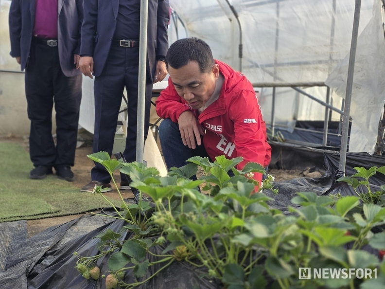 김진태 후보는 가장 먼저 마을 내 딸기농장을 방문해 운영 현황을 살폈다. 김진태 후보는 딸기에서 시작해 신선초와 케일 등으로 작물을 늘리며 마을을 농촌체험휴양마을로 일궈낸 주민들의 자구 노력에 깊은 존경의 마음을 표했다.