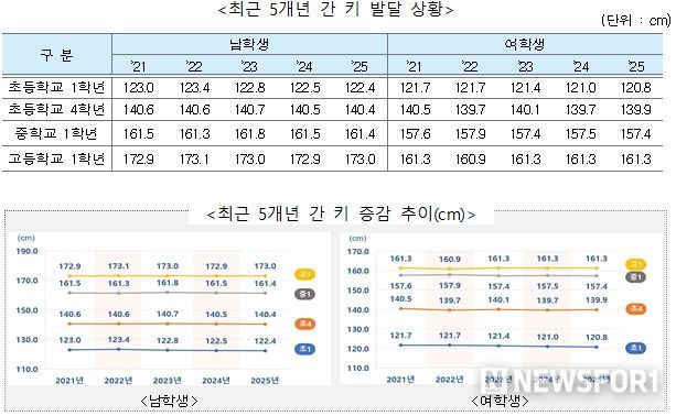 키 발달 상황을 보면, 남학생의 경우 초등학교 1학년은 122.4cm, 4학년은 140.4cm, 중학교 1학년은 161.4cm, 고등학교 1학년은 173.0cm이다. 여학생의 경우 초등학교 1학년은 120.8cm, 4학년은 139.9cm, 중학교 1학년은 157.4cm, 고등학교 1학년은 161.3cm로 남·여 학생 모두 이전 연도와 유사했다.