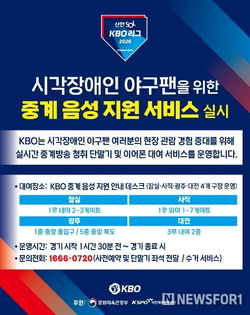 뉴스포원(NEWSFOR1) 편집국 기자 | KBO는 2023년부터 잠실, 사직, 광주 구장에서 운영해 온 ‘KBO 리그 시각장애인 현장 관람객 대상 중계 음성 지원 서비스’를 올해 대전 한화생명 볼파크까지 확대해 총 4개 구장에서 운영한다.