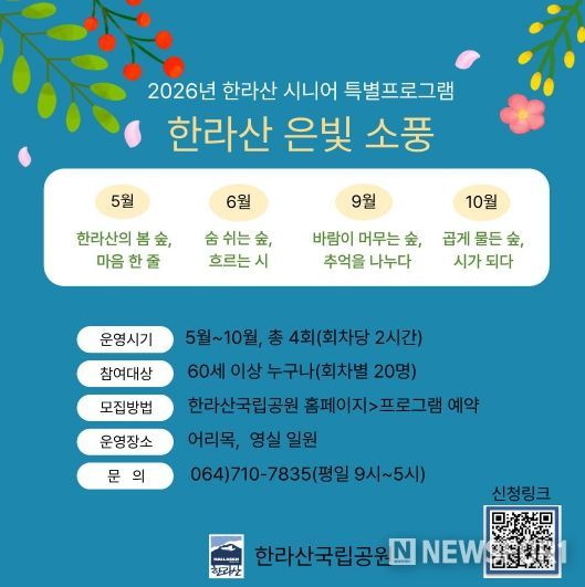 뉴스포원(NEWSFOR1) 윤경덕 기자 | 제주특별자치도 세계유산본부 한라산국립공원관리소는 5월부터 10월까지 총 4회에 걸쳐 어리목, 영실 일대에서 시니어를 위한 특별프로그램‘한라산 은빛 소풍’을 운영한다.