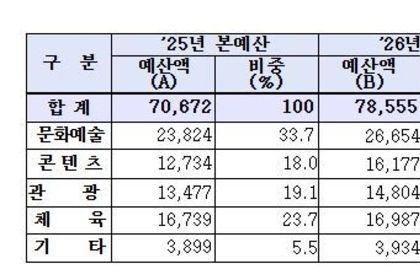 뉴스포원(NEWSFOR1) 윤서빈 기자 | 문화체육관광부는 2026년도 문체부 예산이 7조 8,555억 원으로 최종 확정되었다고 밝혔다. 이는 올해 본예산 대비 7,883억 원(11.2%)이 증가한 규모이다. 문체부는 이번 예산을 ‘케이-컬처’ 300조 원 시대 출발을 위한 예산으로 콘텐츠산업의 국가전략산업화, 국민이 함께 누리는 관광 등에 주력해 편성했다고 밝힌 바 있다.