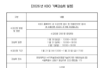 뉴스포원(NEWSFOR1) 편집국 기자 | 2026년 KBO 기록강습회가 1월 30일(금)부터 2월 1일(일)까지 서울 한양대학교에서 개최된다. 기록강습회는 야구 공식기록법의 보급과 이해를 통한 저변 확대를 목적으로 프로야구 원년인 1982년부터 개최됐다.