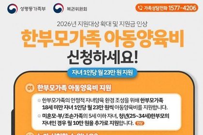 - 한부모가족의 안정적 자녀양육 환경 조성을 위해 한부모가족 18세 미만 자녀 1인당 월 23만 원씩 아동양육비를 지원합니다.