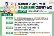 뉴스포원(NEWSFOR1) 편집국 기자 | 음식점업 외국인 근로자 '26년도 2회차 고용허가 신청 ■ 신청기간: 2026.4.20.(월)~5.6.(수) ■ 신청 요건 · 업종 한식 음식점업(한국표준산업분류 상 5611), 외국식 음식점업(5612) *고용보험 시스템에 등록된 업종 기준(실제 영업을 영위하는지 여부 등은 '사업자등록증' 또는 '영업신고증'으로 증빙) *기관구내식, 출장이동식, 기타간이, 주점, 비알코올 음료점은 미허용 · 업력 고용허가서 신청일 기준으로 한식·외국식 음식점업으로 연속하여 5년 이상 영업 유지(휴업 기간 포함) *부가가치세 과세표준증명원상 과세기간 또는 사업자등록증상 '개업년·월·일'로 확인 · 고용인원 내국인 근로자 1인 이상 5인 미만 사업장은 1명, 5인 이상 사업장은 2명까지 가능 *내국인근로자(피보험자) 수는 고용부에서 고용보험시스템 전산 확인 · 직무 주방보조원(한국표준직업분류 상 95220) 및 음식 서비스 종사원(45311) *현장 여건에 맞게 직무범위 탄력적 운영 가능 · 문의 - 고용노동부 상담센터 ☎1350 · 신