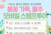 뉴스포원(NEWSFOR1) 윤경덕 기자 | 울산 울주군이 봄을 맞아 오는 23일부터 다음달 30일까지 한시 관광이벤트를 진행한다고 20일 밝혔다. 이번 한시 이벤트는 다양한 연계 이벤트로 울주군 방문 관광객의 참여도와 만족도를 높이고, 체류시간과 지역소비를 확대하기 위해 마련됐다. 올해 새롭게 리뉴얼된 K스탬프투어 모바일 앱을 이용한 ‘봄꽃 가득, 울주’ 이벤트와 ‘울주와봄’ SNS 여행후기 인증 이벤트 등으로 구성됐다. ‘봄꽃 가득, 울주’ 이벤트는 울주군 내 지정 봄꽃 명소 10개소 중 8개소 이상을 방문해 스탬프를 획득한 뒤 선물을 신청하면 된다. 주요 코스는 울주군 벚꽃 명소인 △작천정 벚꽃길 △서생포왜성 △두서면 차리마을 벚꽃길 △회야강변 벚꽃길 등이다. 울주군은 이벤트 참여자 중 추첨을 거쳐 총 70명을 선정해 울주특산품을 제공한다. ‘울주와봄’ SNS 여행후기 인증 이벤트는 ‘봄꽃 가득, 울주’ 이벤트 코스 중 1개소의 사진과 울주군 숙박시설, 식당, 카페 중 1개소 영수증을 첨부해 개인 SNS(인스타그램)에 게시하면 된다. 여행후기 작성자 중 70